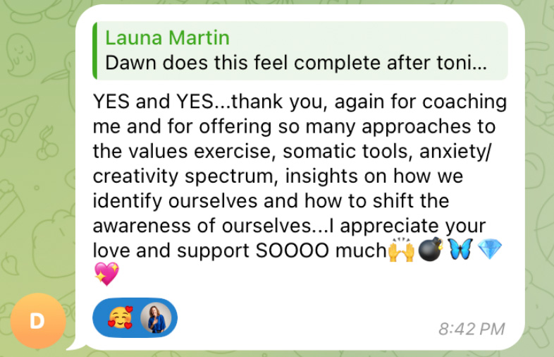 Launa’s approach is holistic and direct. She goes right to the heart of things. Her brilliance for helping others access their full creative power is contagious and her clients consistently report feeling deeply seen, supported, more inspired and capable as people, partners, and parents.