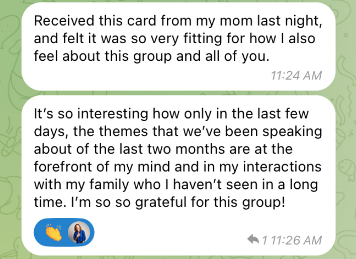 Stay in close contact with one another in our private virtual space, where every topic is welcome. Drop questions and receive personalized coaching between calls.